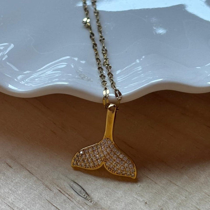 Este collar de acero inoxidable chapado en oro 18K combina un estilo elegante y veraniego, perfecto para usar todo el año o lucir en días soleados y ocasiones especiales. Su cadena dorada resistente sostiene un dije en forma de cola de ballena con incrustaciones de circonitas, aportando un toque delicado, brillante y moderno.